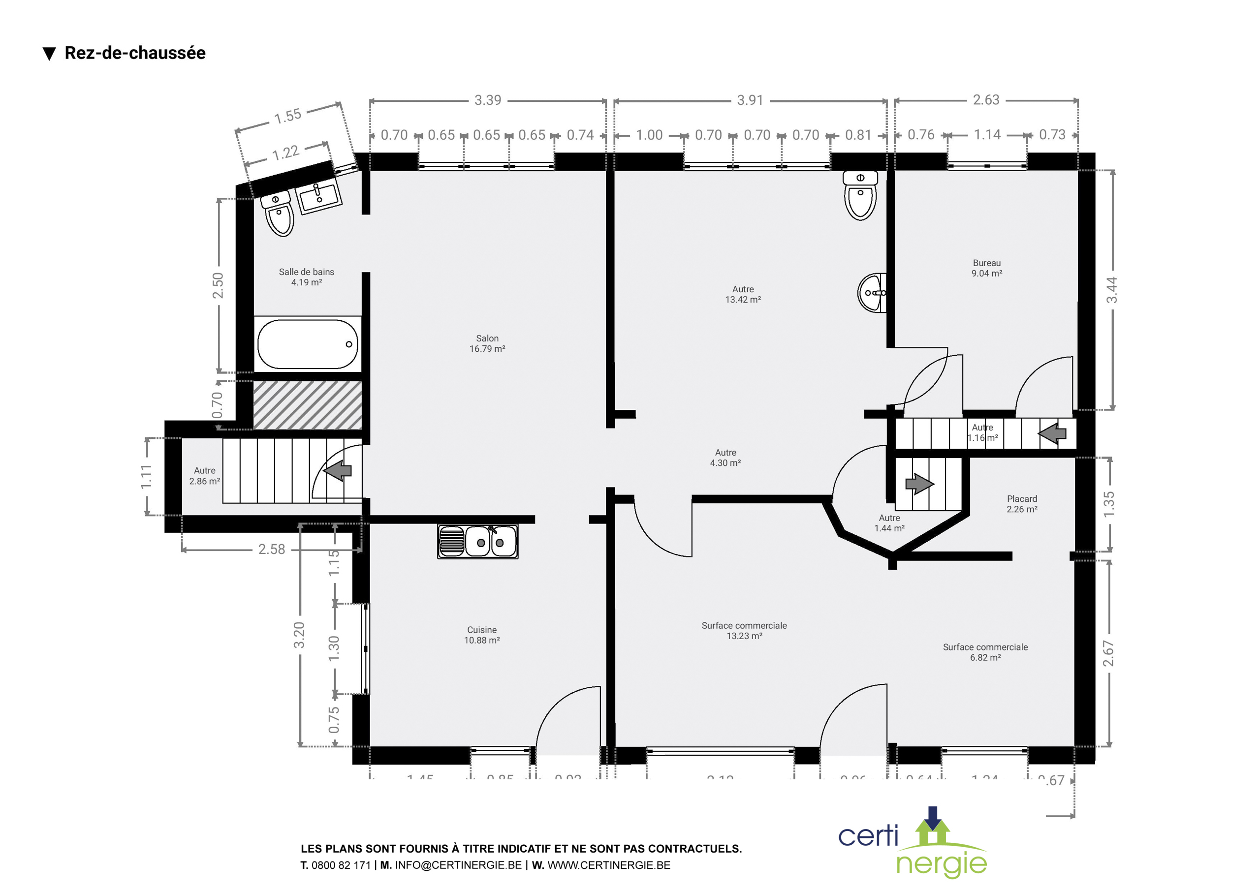 Rez-de-chaussée : surface commerciale, cuisine, salon, chambre, bureau, salle de bains.