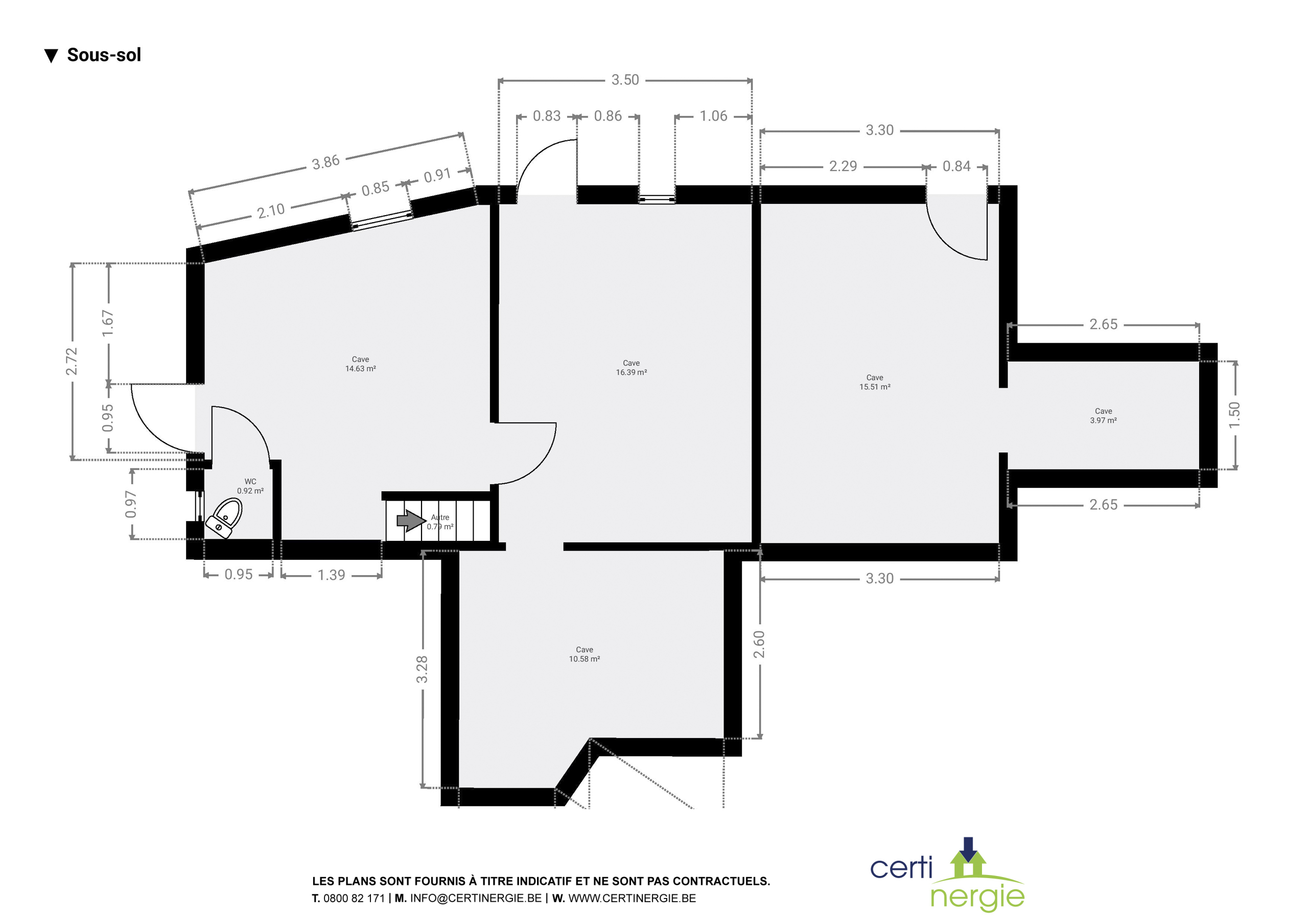 Sous-sol : grandes caves avec chaufferie, cuves et acces extérieur.